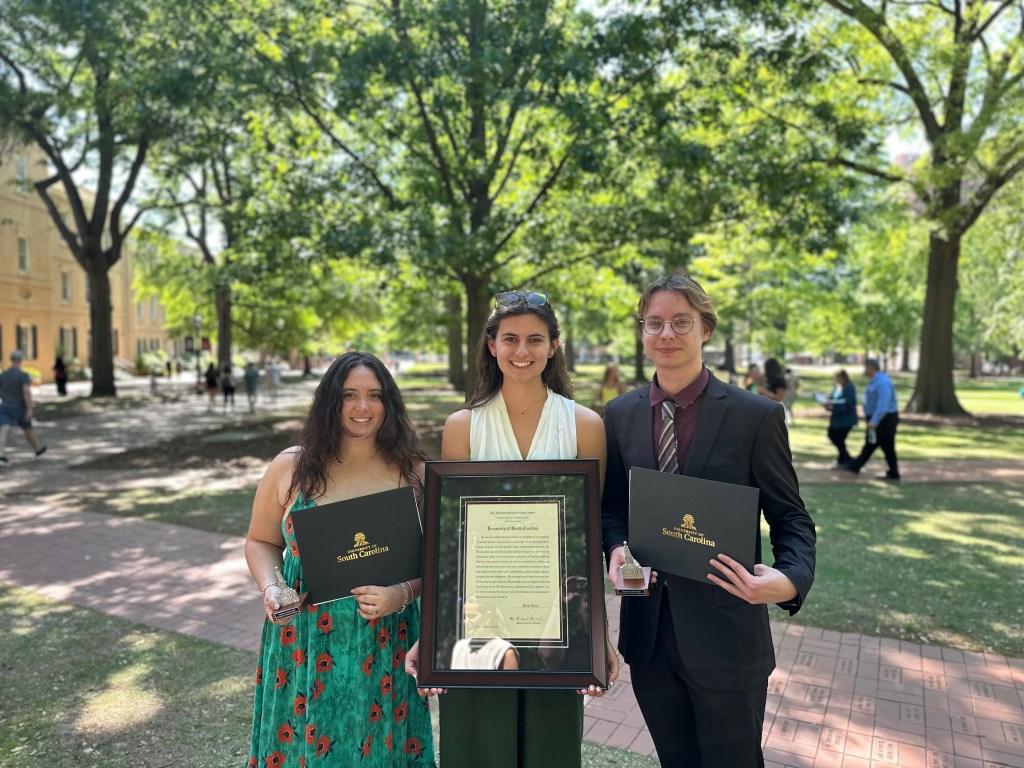 04/17/2025 – Congratulations to our undergraduates Abby and Chris on their awards at USC’s annual Awards Day. Abby was presented with the Victor Laurie Junior Year Scholarship and Chris received the Outstanding Senior and President’s Awards.
